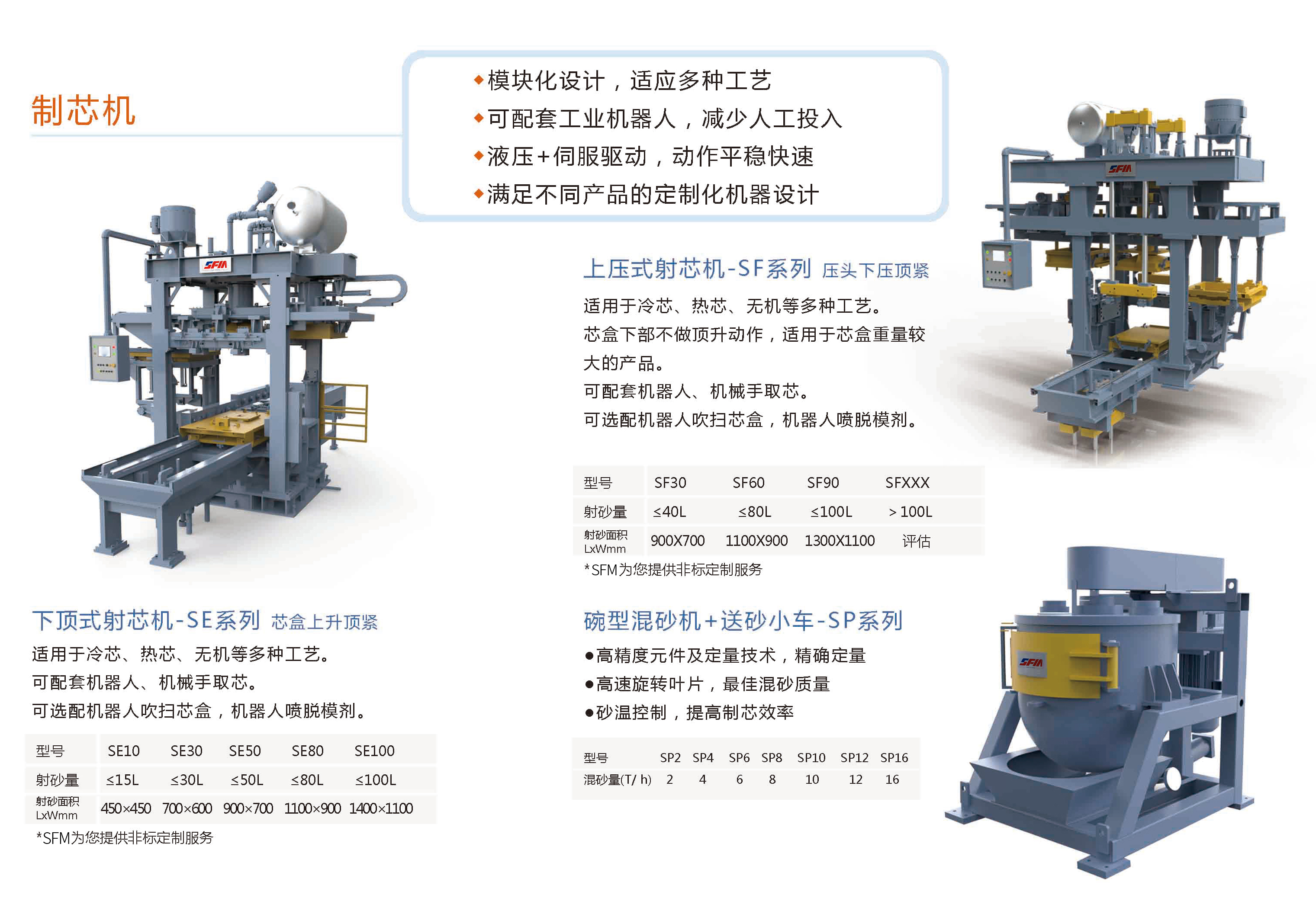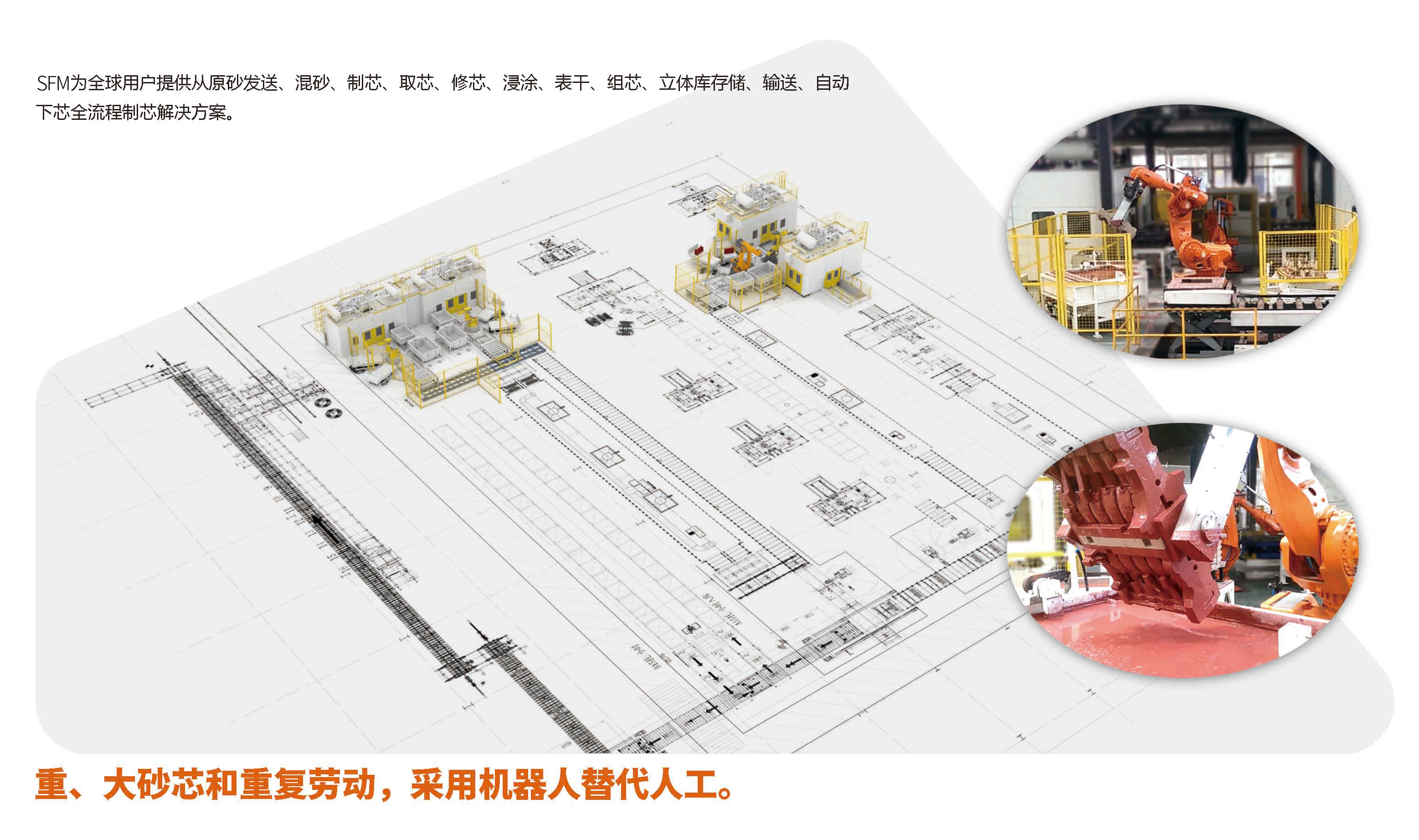 SFM为全球用户提供从原砂发送、混砂、制芯、取芯、修芯、浸涂、表干、组芯、立体库存储、输送、自动下芯全流程制芯解决方案